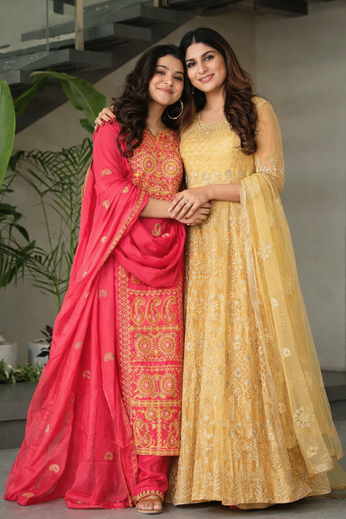 Choose Eid dresses in coordinated pastels or jewel tones — each sister can pick a silhouette that suits her while staying within the same palette.