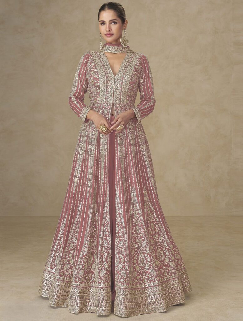The jacket style Anarkali suit is one of the most fashion-forward ethnic wear trends in 2026. This style adds structure and dimension through long embroidered jackets, short crop overlays, cape jackets, or sheer embellished layers.